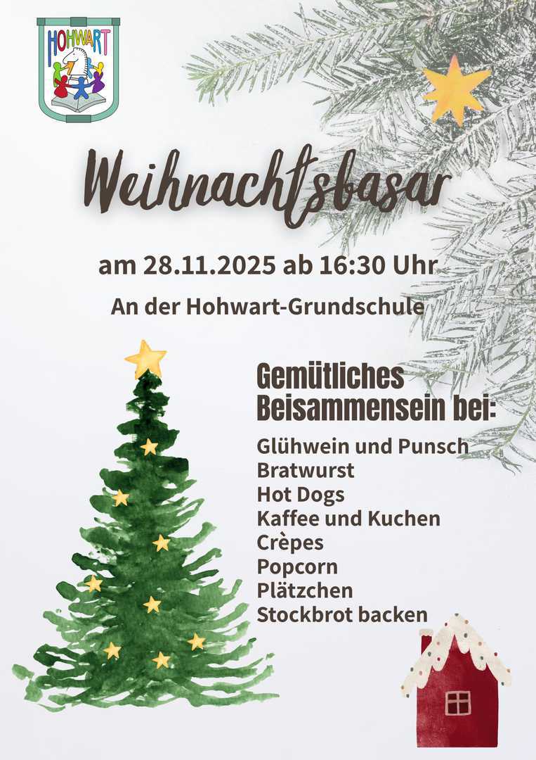 Am Freitag, 29.11.2024 fand der diesjährige Weihnachtsbasar an der Hohwart Grundschule bei etwas bescheidenen Wetterverhältnissen statt. Nachdem zum Auftakt die Gäste durch die einzelnen Jahrgänge in musikalischer Form eingestimmt wurden, boten sich dann zum Naschen, Genießen, Ausprobieren und Stöbern zahlreiche Gelegenheiten an. Für das leibliche Wohl sorgte eine Popcorn- & Crêpes-Bar, ein gut bestückter Plätzchen- und Kuchenstand sowie der Grillstand. Hier die ersten Eindrücke.